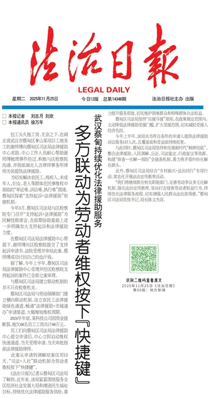 蔡甸区司法局与劳动保障部门建立横向联动机制,设立农民工法律援助绿色通道,畅通“法律援助+市域通办”申请渠道,大幅缩短维权周期。